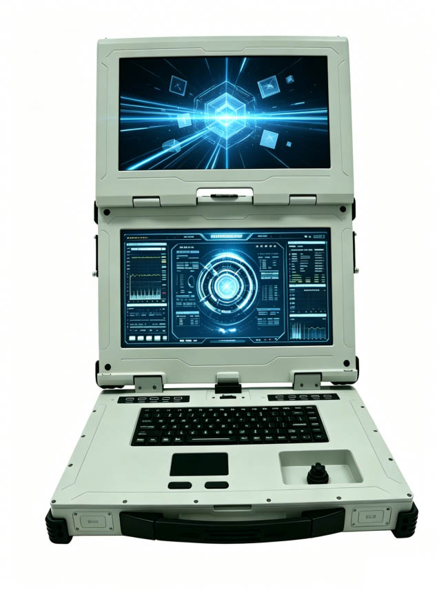 产品配备两个上下可折叠15.6寸高清分辨率1920*1080显示屏,具备摇杆、键盘和鼠标触控板功能。全机接口均采用FX系列航空连接器,整机全加固设计,可选择多种安装方式满足不同复杂环境使用。